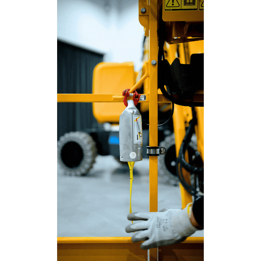 The operator is immediately alerted by an audible and visual alarm if using the machine without being attached to the FASTN system. If their lanyard is not anchored after a few seconds, FASTN also alerts the worksite with a blue flashing light and a louder alarm.